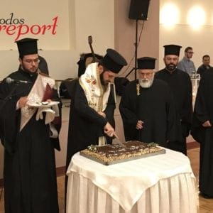 Πριν ξεκινήσει το γλέντι, ο τηλεοπτικός σταθμός ΘΑΡΡΙ έκοψε την πίτα του, την οποία ευλόγησε ο Θεοφιλέστατος Επίσκοπος Ολύμπου κ. Κύριλλος.