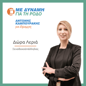 «Η απογοήτευση για την κατάσταση που επικρατεί στον πρωτογενή τομέα στη Ρόδο, με υποχρεώνει να συμμετέχω στις Δημοτικές Εκλογές, για να καταφέρουμε να την αλλάξουμε. Συμπορεύομαι με τον Αντώνη Καμπουράκη στο συνδυασμό «Με Δύναμη Για τη Ρόδο», γιατί είμαι σίγουρη για τις ικανότητες και την αποτελεσματικότητά του, ώστε και ο πρωτογενής τομέας να αναπτυχθεί στο νησί μας.»