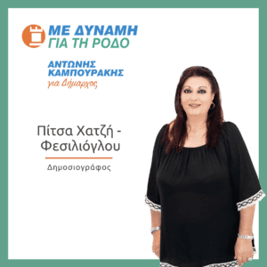 «Ως ενεργή πολίτης, θεωρώ απαραίτητη τη συμμετοχή μου στις Δημοτικές εκλογές, παρά τη στείρα κριτική από τον καναπέ του σπιτιού μου. Συμμετέχω στο συνδυασμό «Με Δύναμη Για τη Ρόδο», με τον Αντώνη Καμπουράκη, γιατί εκτός του ότι θέλει, είμαι βέβαιη ότι μπορεί να δώσει στο νησί μας, την αίγλη και τη λάμψη που του αξίζει.»