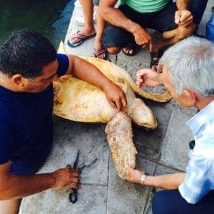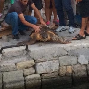 Μια τραυματισμένη χελώνα εμφανίστηκε πριν από λίγη ώρα στο λιμάνι της Σύμης, σε μια προσπάθεια της να ζητήσει βοήθεια όπως φαίνεται. Οι κάτοικοι κατάφεραν να πιάσουν τη χελώνα, η οποία είναι τραυματισμένη στο ένα της πόδι, την φρόντισαν όσο μπορούσαν, την προστατεύουν σε περιφραγμένο ασφαλές χώρο και αύριο θα μεταφερθεί στη Ρόδο στον Υδροβιολογικό σταθμό για να την φροντίσουν όσο καλύτερα μπορούν οι ειδικοί.