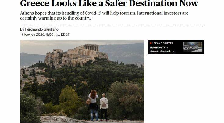 H επιτυχής διαχείριση της Covid-19 από την κυβέρνηση ανταμείβεται, σημειώνει ο Φερντινάντο Τζουλιάνο σε άρθρο του στο Bloomberg με τίτλο: «Η Ελλάδα φαίνεται πιο ασφαλής προορισμός τώρα». Ο αρθρογράφος αναφέρει ότι ο πρωθυπουργός, Κυριάκος Μητσοτάκης, ήταν σε θέση να ανοίξει ξανά την εγχώρια οικονομία πριν από άλλες χώρες, κάτι που θα περιορίσει το πλήγμα στο Ακαθάριστο Εγχώριο Προϊόν (ΑΕΠ). Η κυβέρνηση, προσθέτει, έλαβε μέτρα με υψηλό κόστος – όπως τα δάνεια για μικρές και μεσαίες επιχειρήσεις και ένα σχήμα διαθεσιμότητας για τους υποαπασχολούμενους – για να βοηθήσει τις επιχειρήσεις και τους εργαζόμενους και ελπίζει ότι θα τα περιορίσει ταχύτερα από αλλού καθώς η δραστηριότητα ξαναρχίζει, μειώνοντας το βάρος στα δημόσια οικονομικά.